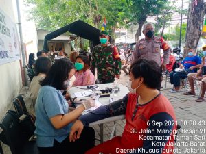 Jakarta Barat, Updatetodaynews.com – Serbuan Vaksinasi TNI/Polri Koramil 01 Tamansari Kodim 0503JB dan Polsek Tamansari Polres Metro Jakarta Barat setiap hari nya menargetkan 200 orang namun jumlah tervaksin setiap hari nya semakin bertambah baik dari warga yang berdomisili di Tamansari sesuai KTP, maupun warga masyarakat yang bukan domisili di Tamansari.