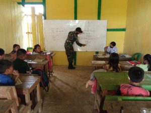 Prada Rizky dan dua personel Satgas dari SSK IV Pos Sei Beruang mengajarkan materi Matematika berhitung dan membaca.