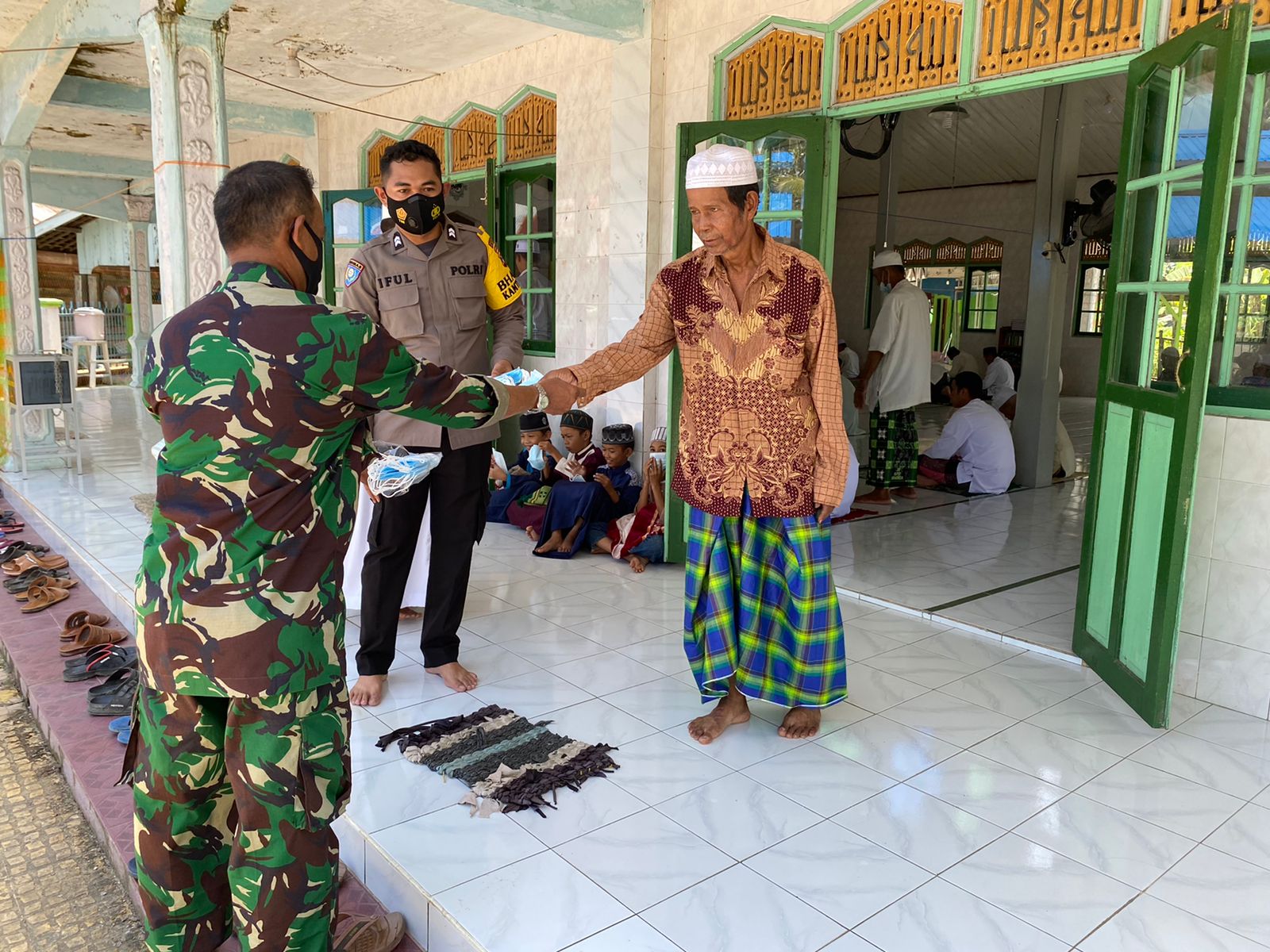 Protokol kesehatan dilakukan di masjid Nurul, Yakin desa Ramtau Keminting dengan melakukan himbauan dan membagikam masker gratis kepada jamaah sholat Jum’at.