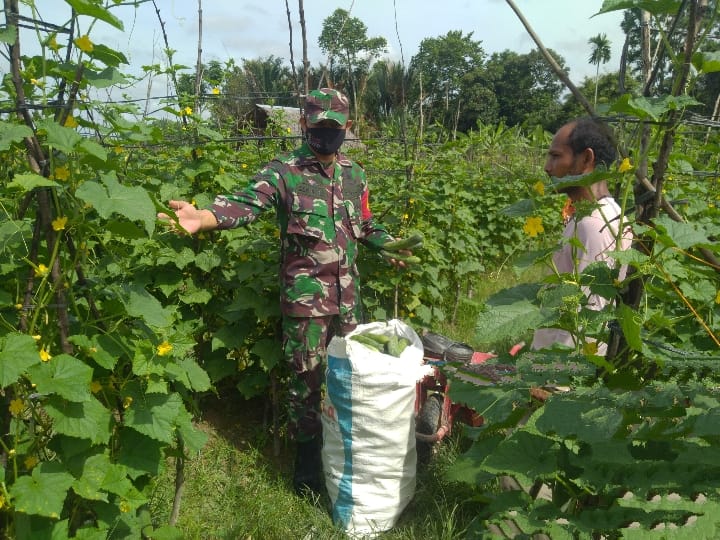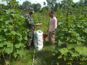 Berikan Motivasi dan Semangat Petani, Babinsa 23/Lgst Dampingi Panen Buah Mentimun
