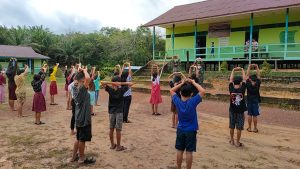 Pratu Dedi Susanto dan personel Satgas lainnya dari Pos Sei Tekam mengajarkan senam dan materi olah raga lainnya.