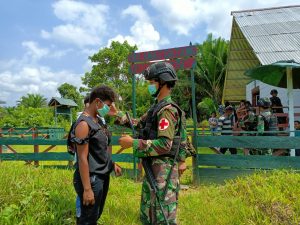 Papua, Updatetodaynews.com – Membantu pemerintah dalam mencegah penyebaran Covid-19, personel Pos Towe Hitam Satgas Pamtas RI-PNG Yonif Mekanis 403/Wirasada Pratista menggelar sosialisasi tentang bahaya Covid-19 dan membagikan masker kepada warga di Kampung Towe Hitam Distrik Towe Kabupaten Keerom, Papua.