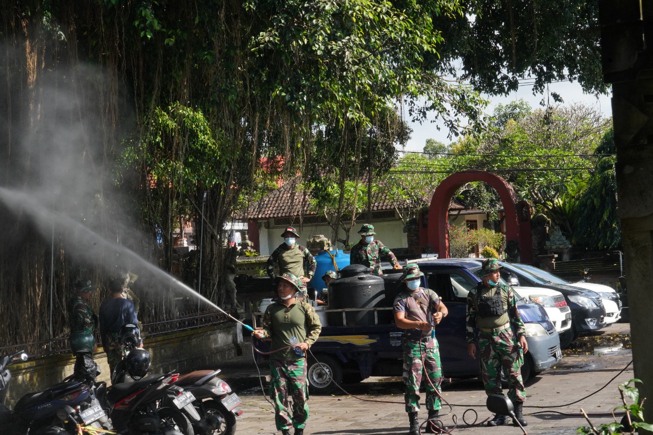 Seperti halnya wilayah Desa Batubulan mendapatkan giliran program penyemprotan eco enzyme Korem 163/Wira Satya pada Hari Selasa (14/9/2021).