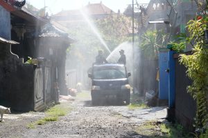 “Sekarang kita semprotkan di wilayah Desa Batubulan”, jelas Kapenrem 163/Wira Satya Mayor Arm Ida Bagus Putu Diana, S.S., di lokasi kegiatan.