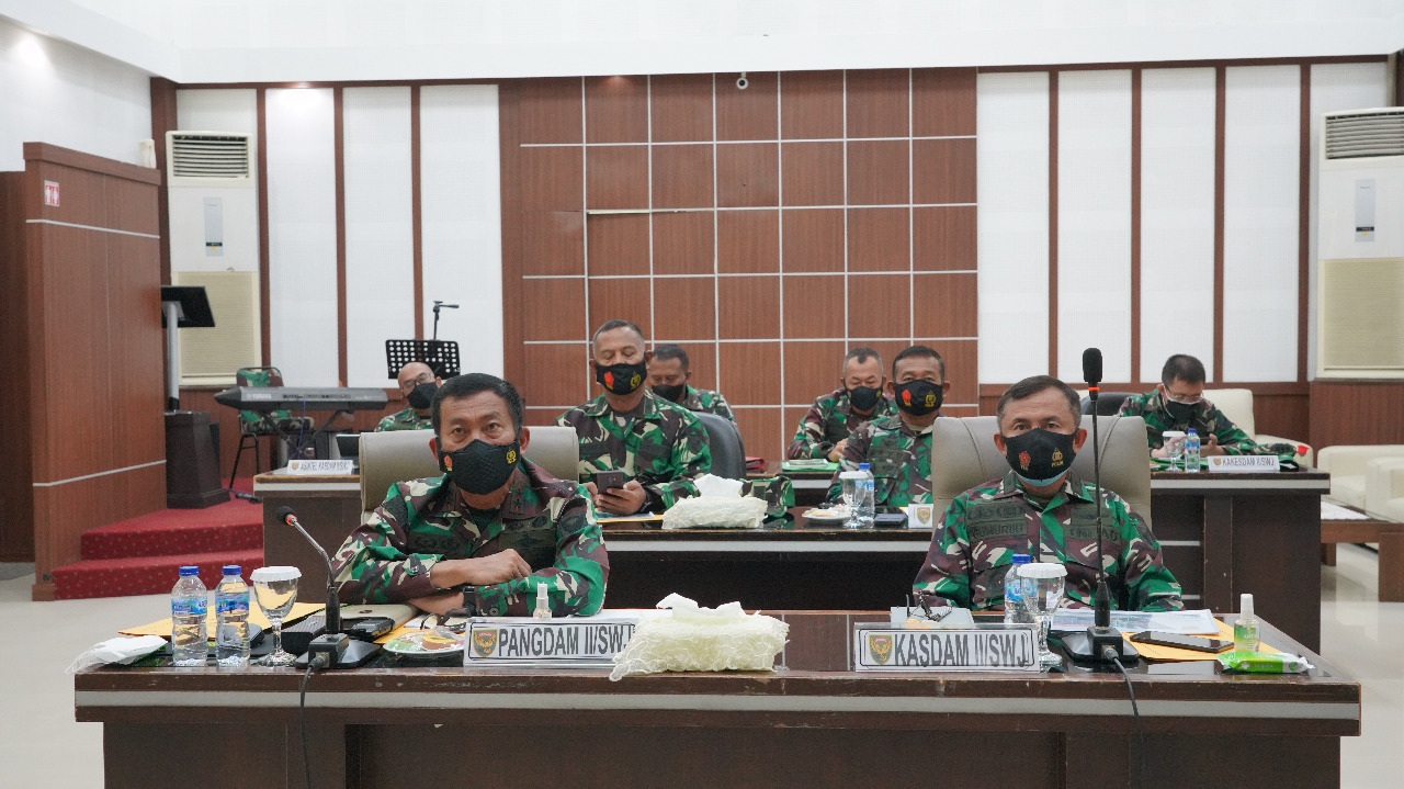 Palembang, Updatetodaynews.com – Pangdam II/Sriwijaya Mayjen TNI Agus Suhardi, mengikuti Rapat Koordinasi (Rakor) melalui Video Conference (Vicon) dengan Panglima TNI Marsekal Hadi Tjahjanto, Selasa (14/9/2021) bertempat di Ruang Gatot Subroto Makodam II/Swj Jl. Jenderal Sudirman KM. 2,5 Palembang.