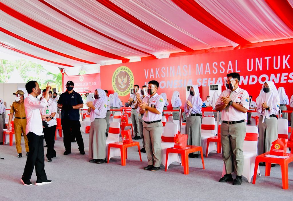 Disini, Presiden sempat berdiskusi dengan para siswa dan menanyakan apakah sudah melakukan belajar tatap muka atau belum, dengan antusias para siswa menjawab sudah.