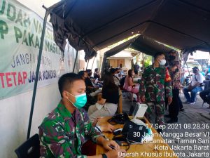 Jakarta Barat, Updatetodaynews.com – Koramil 01/Tamansari Kodim 0503/Jakarta Barat gencar menyelenggarakan vakasinasi untuk masyarakat umum di halaman stadion sepak bola Tamansari Jalan Mangga Besar VI, Rt.08/03, Kelurahan/Kecamatan Tamansari. Jum’at, 17 September 2021.