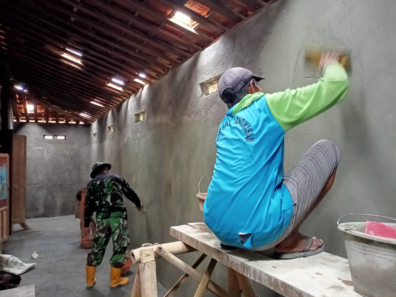 “Masih dilanjutkan pekerajaan sana-sini, diantaranya adalah menyelesaikan pengacian dinding dan pemlesteran lantai, kita sedang fokus kepada dua pekerjaan itu sekarang,”ungkap Babinsa Serda Yulianto.