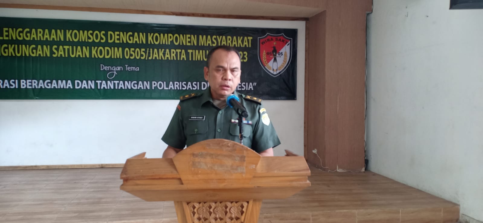 Dandim 0505/Jakarta timur Letkol Arm Suyikno,S,Sis, M.Si dalam sambutannya yang dibacakan Pasiter Mayor Inf Nawawi Affandi mengatakan, dengan mengangkat tema ‘Moderas Beragama dan Tantangan Polarisasi di Indonesia ” kegiatan Komsos ini sebagai ajang silaturahmi antara TNI dengan komponen masyarakat di wilayah Jakarta timur. “Selain itu dari kegiatan ini akan terjalin tali silaturahmi antara Kodim 0505/JT dengan semua unsur, baik Polres Metro Jakarta timur, Pemda dan Komponen Masyarakat, guna membangun masyarakat Indonesia yang berkarakter dengan berlandaskan wawasan kebangsaan dalam rangka mewujudkan persatuan dan kesatuan Bangsa,” ucapnya.