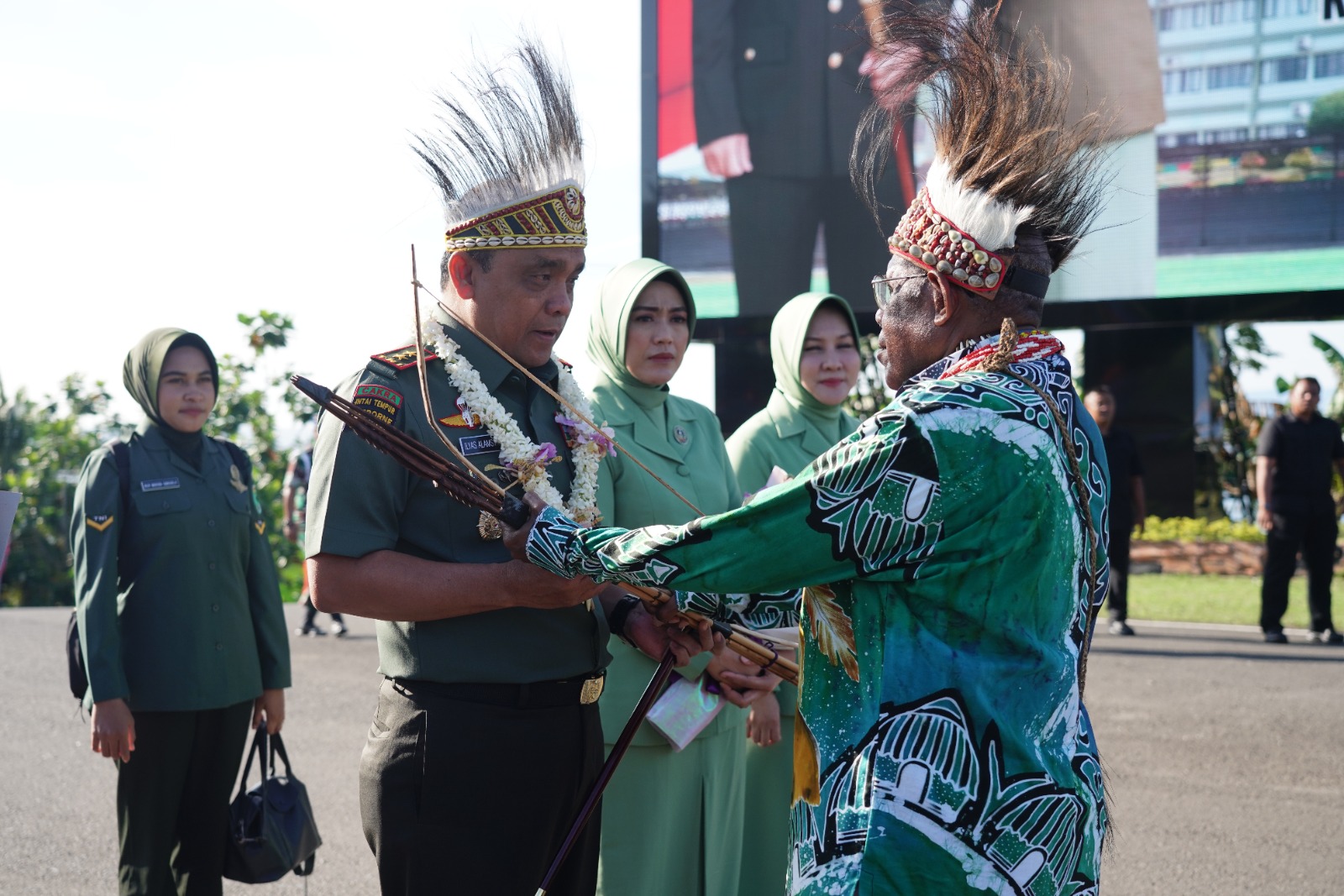 Pemasangan topi adat dan penyerahan panah tradisional oleh Tokoh Adat Suku Arfak, Obeth Ayokh mengawali tradisi penyambutan Pangdam XVIII/Kasuari yang baru, dilanjutkan arakan Pangdam dengan iringan lagu “Selamat Datang”, kemudian Pangdam menerima laporan pos jaga dan hormat jajar personel dinas jaga kesatrian serta pedang pora para Perwira Pertama dan penciuman Pataka Kodam XVIII/Kasuari “Patriot Pembela Rakyat”, mewarnai suasana tradisi penyambutan terhadap putra asal Sumatera Utara, dan Ny. Vera Ilyas Alamsyah sebagai Ketua Persatuan Istri Tentara (Persit) Kartika Chandra Kirana (KCK) Daerah (PD) XVIII/Kasuari yang baru menggantikan Ny. Alin Gabriel Lema.(Pendam XVIII/Ksr)