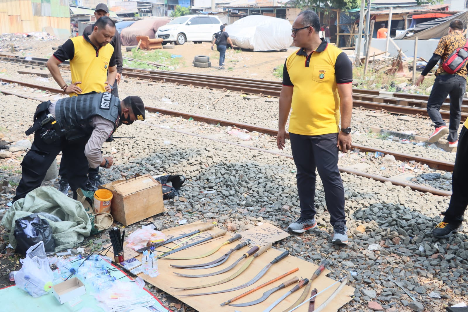Gerebek Kampung Bahari, Sita Belasan Senjata Tajam & Bongkar Gubuk Liar di Bantaran Rel