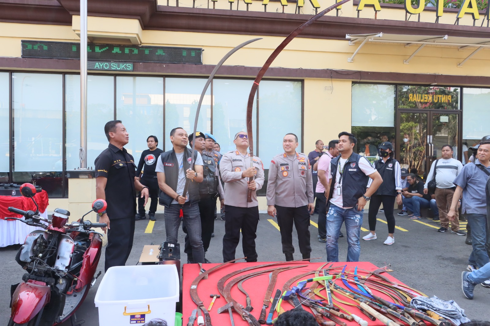 “Barang bukti 60 bilah senjata tajam, sepucuk senapan angin, 2 pucuk senjata PCP berikut 6 pelontar anak panah, 3 pucuk airsoft gun dan 5 unit sepeda motor,” jelasnya.