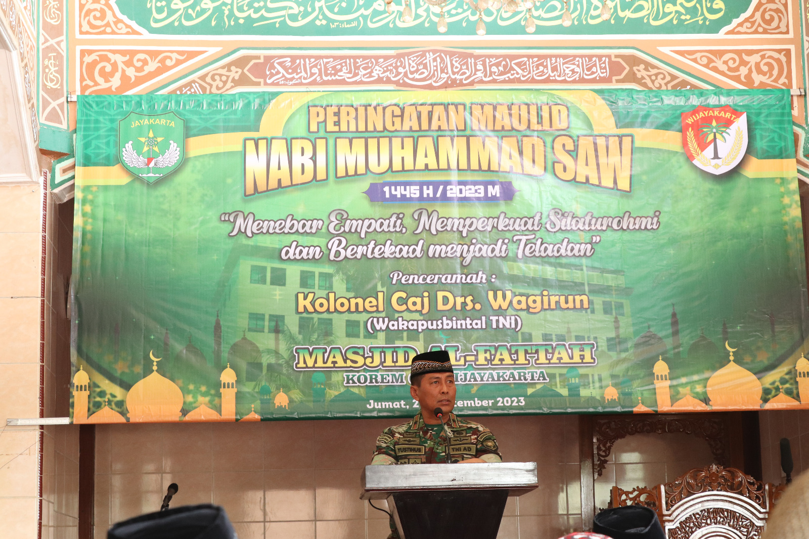 Danrem 051/Wkt Brigjen TNI Yustinus Nono Yulianto, S.E., M.Si., terlihat hadir dalam acara peringatan Maulid Nabi Muhammad SAW.Danrem 051/Wkt, saat memberikan sambutan pada peringatan Maulid Nabi Muhammad SAW 1445H/2023M mengungkapkan,