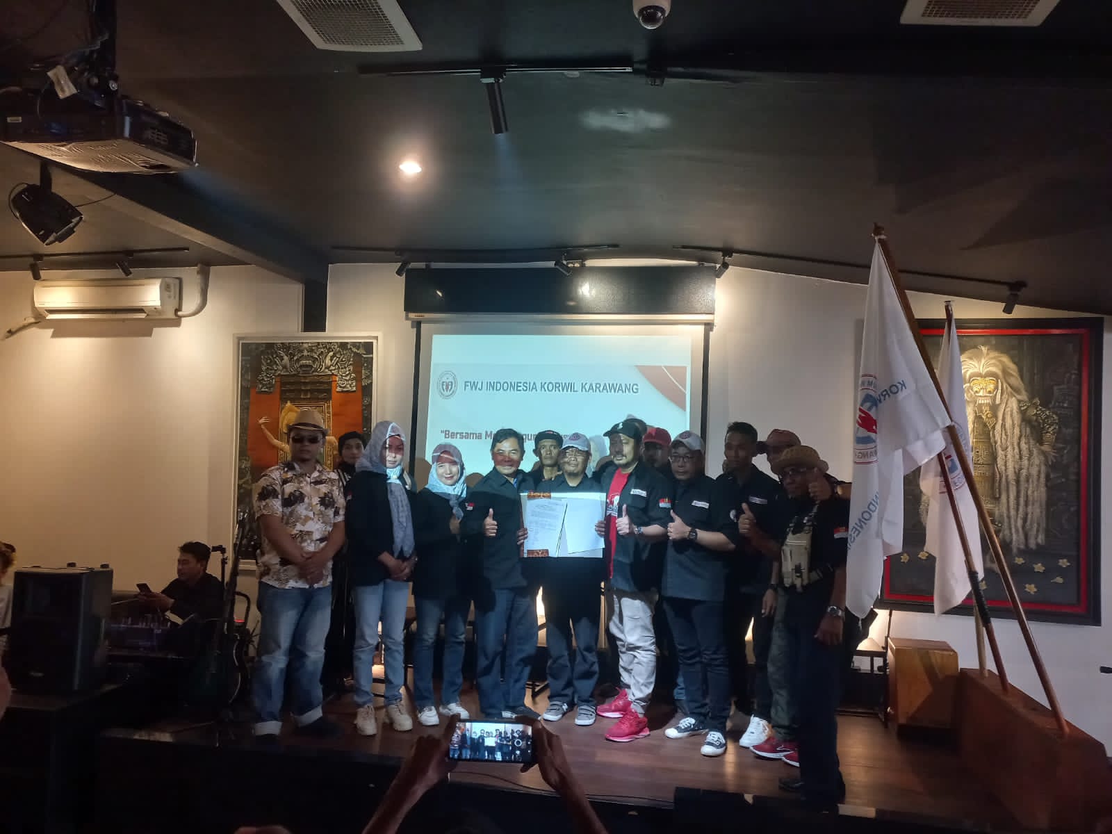 Updatetodaynews.com | KARAWANG Ketua Umum Forum Wartawan Jaya (FWJ) Indonesia, Mustofa Hadi Karya atau yang biasa disapa Opan yang didampingi jajaran Dewan Pimpinan Pusat (DPP) resmi melantik Pengurus FWJ Indonesia Korwil Karawang untuk periode 2023 – 2026. Pelantikan dan pengukuhan itu dikatakan Opan bertempat di Cafe and Resto Dewasena, Jalan Pepaya Kabupaten Karawang, pada hari Minggu, 8 Oktober 2023.