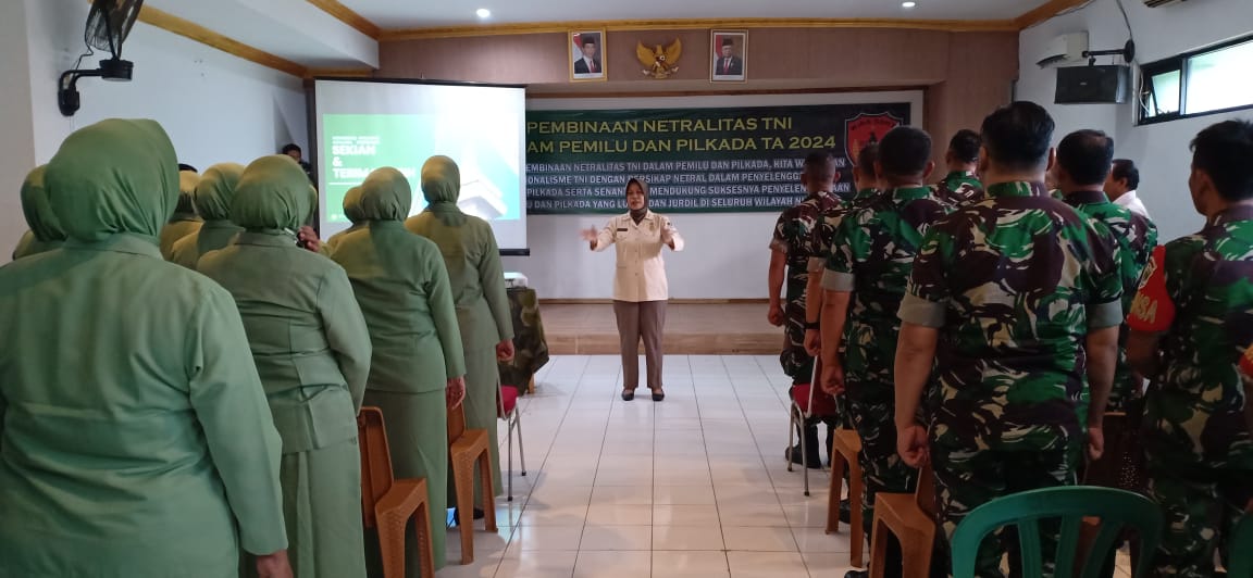 Letkol Arm Dudung Hasanudin Pabandya Puanter Kodam Jaya selaku Narasumber menyampaikan tentang Netralitas TNI yaitu,“Jaga perilaku sikap tutur kata sebagai seorang Prajurit, oleh karena itu diharapkan tetap menjaga netralitas TNI dalam Pemilu dan Pemilukada tahun 2024, karena Netralitas TNI merupakan bagian dari komitmen TNI dalam rangka ikut serta menyukseskan pelaksanaan Pemilu dan Pemilukada.