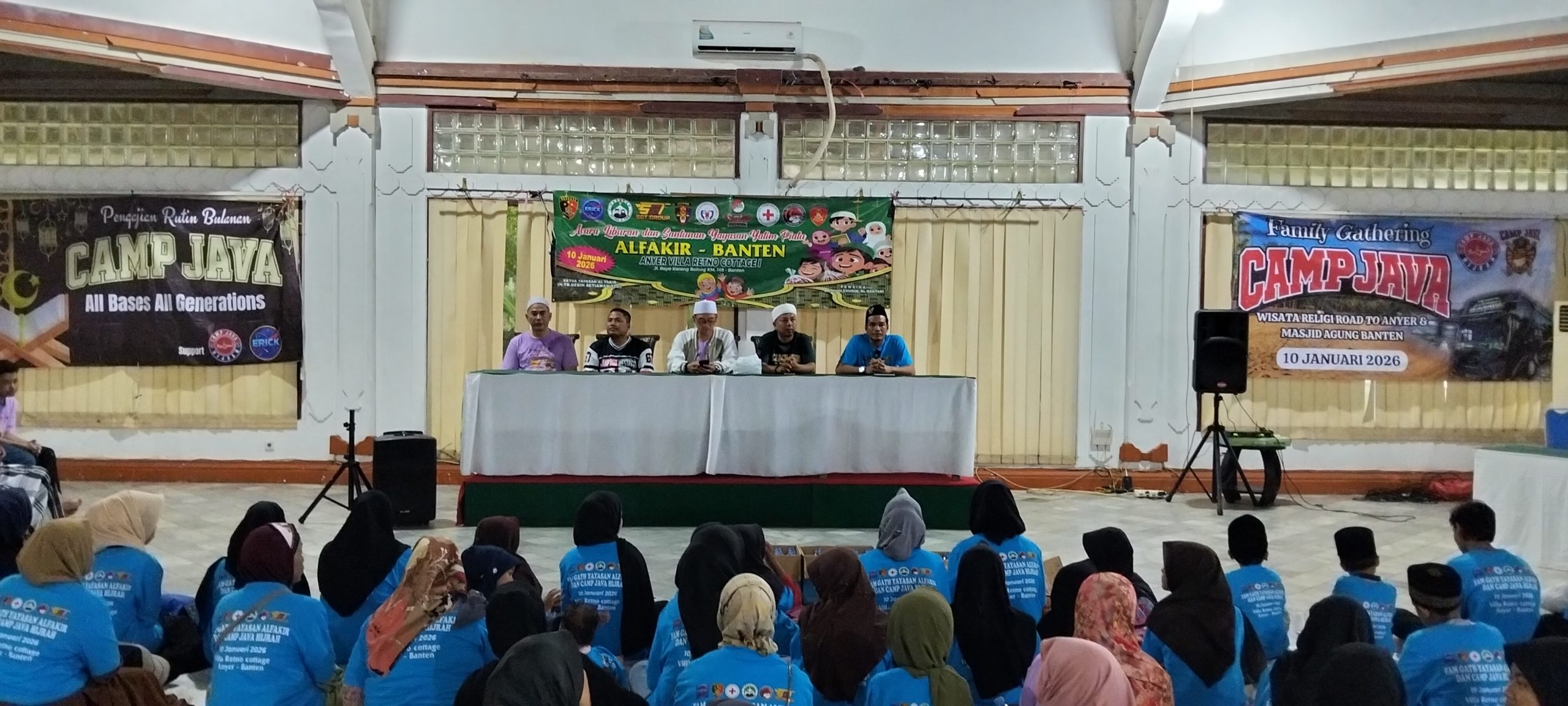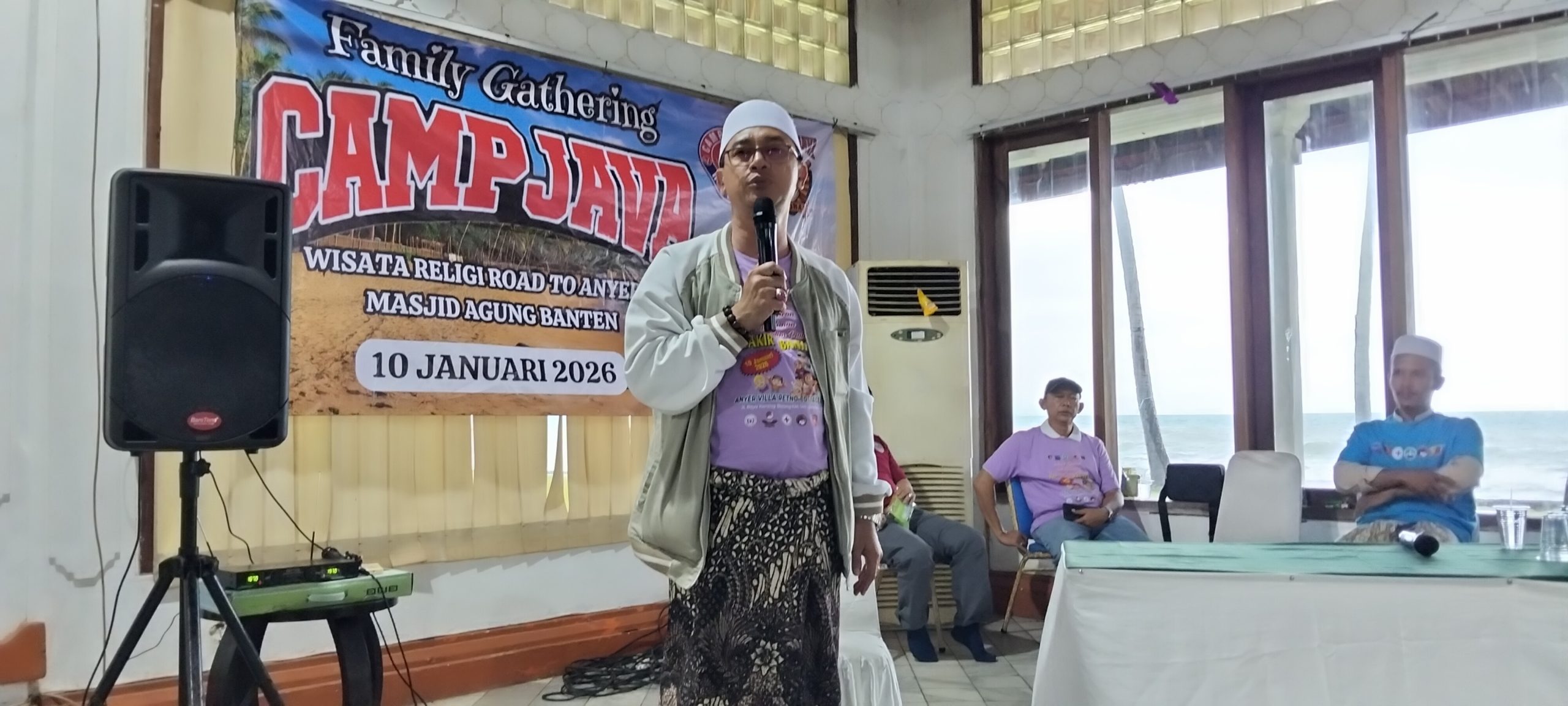 Ustadz Ujang Supriyana menyampaikan. “Assalamualaikum warahmatullahi wabarakatuh, kepada seluruh hadirin yang terhormat, Ketua Acara Haji Fadhil, Bapak Donatur Haji Erick, Ketua Yayasan ALFAKIR Kyai H. Tb Debih Setiawan S.PdI, para perwakilan yayasan dari Pandeglang dan Lebak, sesepuh Camp Java Haji Rusli, perwakilan Forum Wartawan Jaya Indonesia, serta seluruh keluarga besar alumni STM Camp Java dan saudara-saudari yang telah berkumpul di sini hari ini dalam rangkaian acara family gathering dengan tema wisata religi road ke Anyer dan Masjid Agung Banten, sekaligus santunan untuk anak-anak yatim piatu dari Yayasan ALFAKIR Banten.