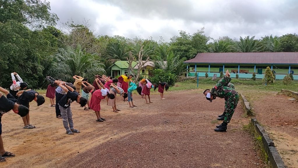 Personel Satgas Yonif 144/JY Ajak Olah Raga Siswa dan Patuhi Protokol Kesehatan