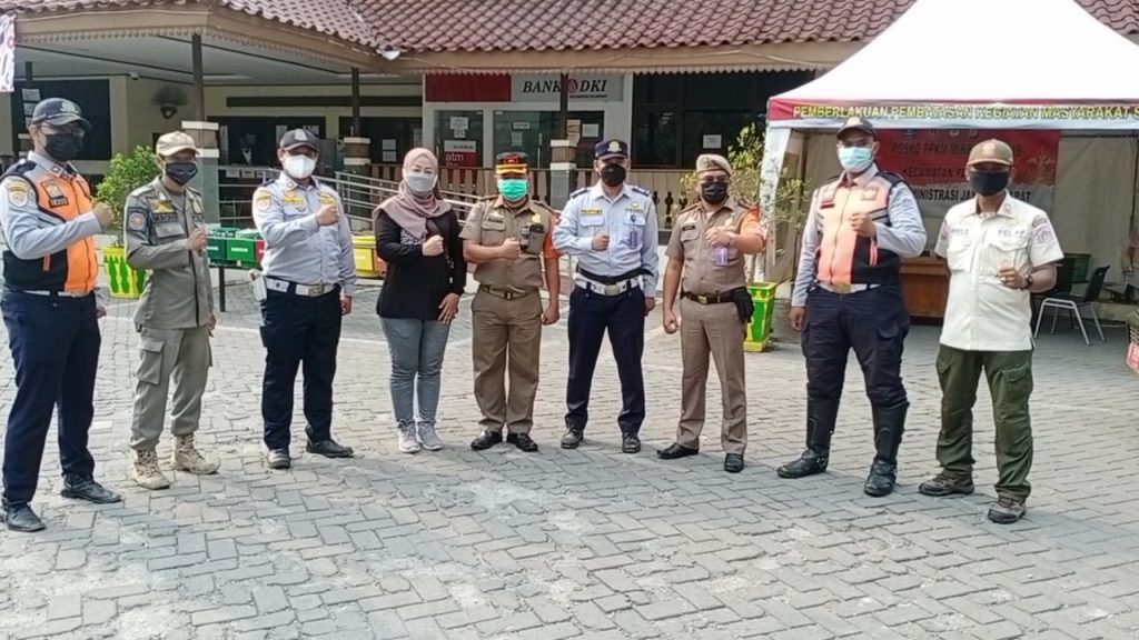 Satpol PP dan Dishub Palmerah Bagikan Makanan dan Minuman bersama Mega Merah Peduli di Pasar Pluis Bintang Mas